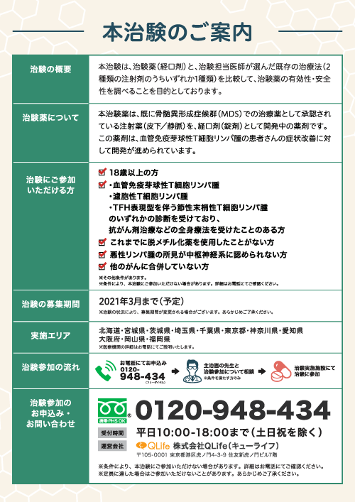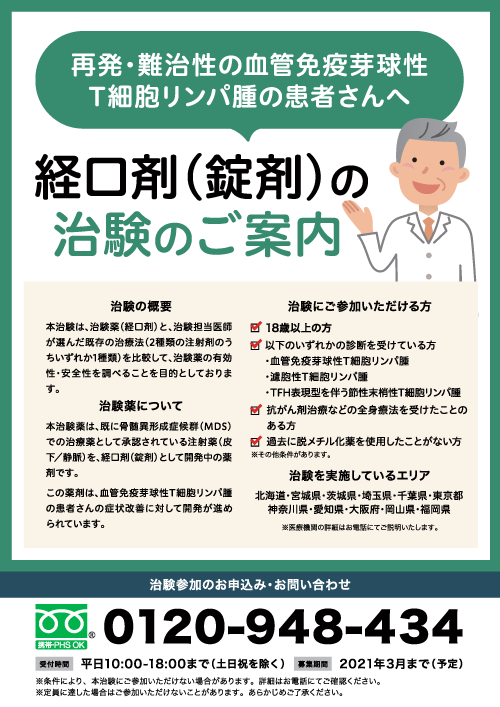 再発・難治性の血管免疫芽腫、T細胞リンパ腫の薬の治験が開始しました