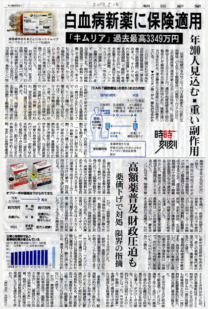 難治性白血病(B細胞性リンパ芽球性白血病)の子ども〜25歳、抗がん剤での治療の効果が無かったリンパ腫(びまん性大細胞が多B細胞リンパ腫)の患者さんに施される治療・キムリアについて保険適用が承認されました。つばさはこの保険適用を歓迎し、必要として待っている患者さんに一日も早く使われますよう、祈っております。 キムリアは高額な値段のために、国民皆保険制度に影響が大きいのでは?ないかという意見や不安もあるようです。 でも同じように骨髄移植も日本で数多く行われるようになった1980年代、ドナーの検査費用と骨髄採取、患者さんの寛解導入の治療、前処置、無菌室代(個室費用とは別)など複雑に費用が重なって合計すると数千万円といわれ、多くは治験医療として行われていました。それでも骨髄移植は、それまで不治の病といわれていた白血病を、たとえ一部の人であれ根治に導くことができたのです。そこに1991年、日本骨髄バンク(当初は骨髄移植推進財団)が稼働し、身内からの移植件数も増えて、医療としての経験が積まれ、治療成績も向上してきました。同時に治療の段階のそれぞれが保険適用されて、高額療養費の範囲で移植が受けられるようになりました。そして移植医療そのものも、末梢血幹細胞移植、さい帯血移植、ハプロ移植と増え、発展しています。 一方、薬による治療も徐々に成績を上げ、血液がんがいつの間にか「治癒に導ける」疾患になりつつあります。血液がん(リンパ腫、白血病、多発性骨髄腫、骨髄異形成症候群)のそれぞれの疾患もまた、持っているがん遺伝子の種類で細分化されますが、その遺伝子の異常に対して効果的な薬や治療法が、1つ、また1つと開発されてきました。新しい薬や治療法は、次々に、治そうとする医療と治りたい患者が待つ臨床現場へと届けられてきたのです。 また私たちは、全ての新規がん治療薬は当初はある一つの疾患のために開発、承認されますが、その多くが次に開発された別の薬と組み合わされて別の疾患に適用される、という朗報をたくさん聞いてきました。つまり私たちは、たとえ対象が少数であっても命を救う治療法や薬が1つ手に入れば、それはまた次に別の疾患を対象とした開発につながることを経験してきたのです。 命を救うための1つの開発は、治療法、副作用、費用などなども含めて試され使いこなされて、次代の医療のインフラとなります。キムリアもきっと次代への架け橋になると期待して、歓迎いたします。 ※詳細な解説が掲載された朝日新聞の記事を紹介します。 [2019/06/05]