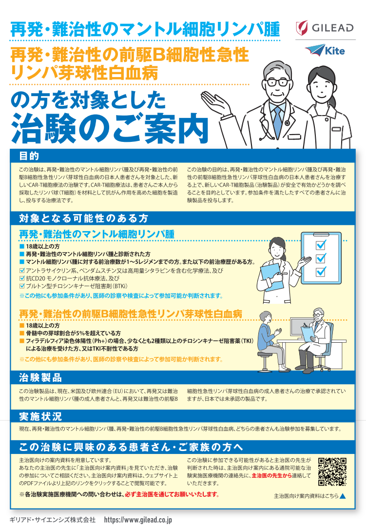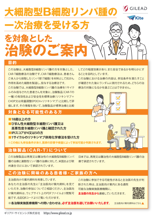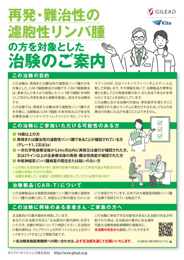 主治医向けの案内資料を用意しています。 ※各治験実施医療機関への問い合わせは、必ず主治医を通じてお願いいたします。 治験依頼者:ギリアド・サイエンシズ株式会社(https://www.gilead.co.jp/) [2024/08/07]